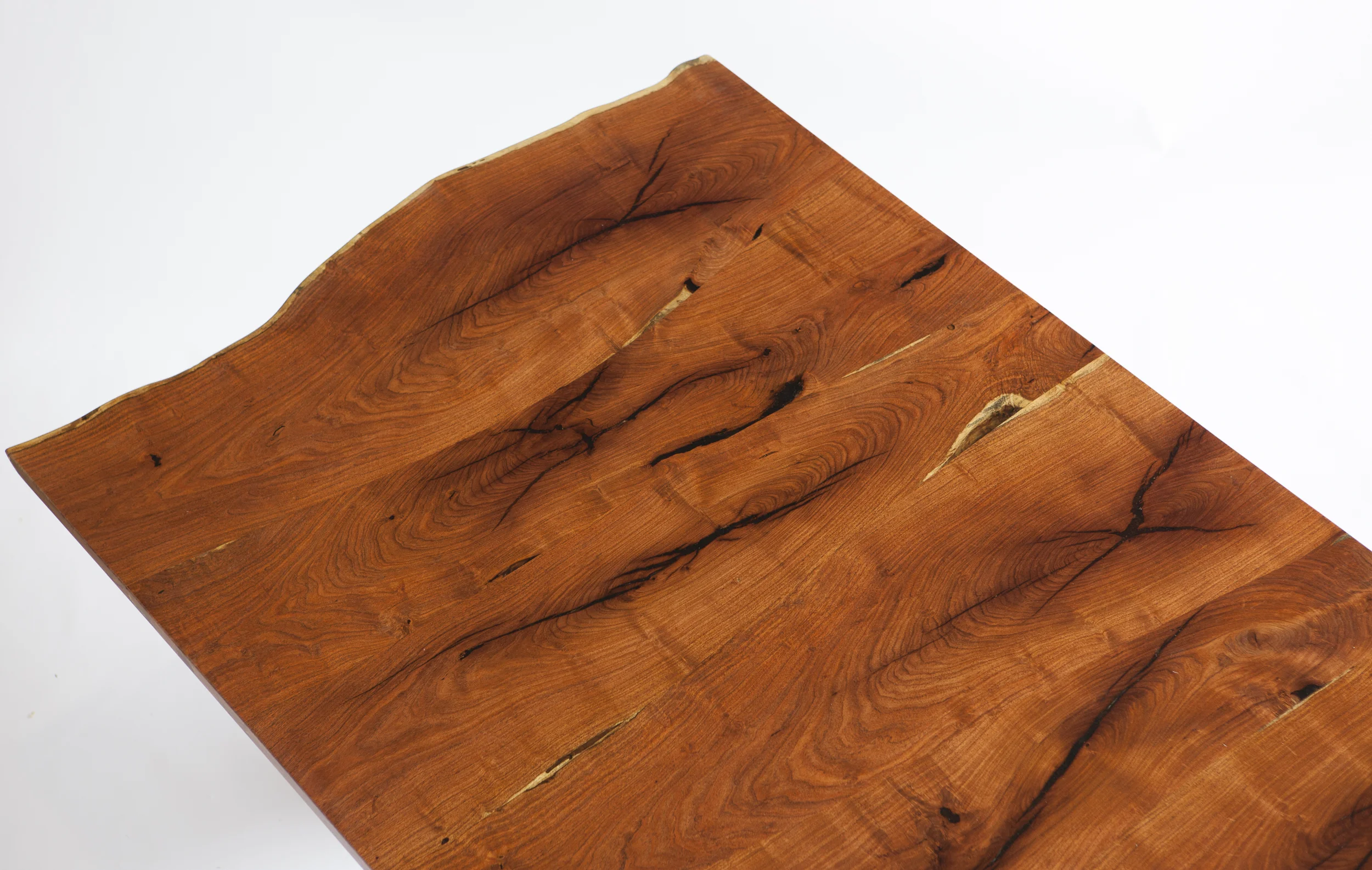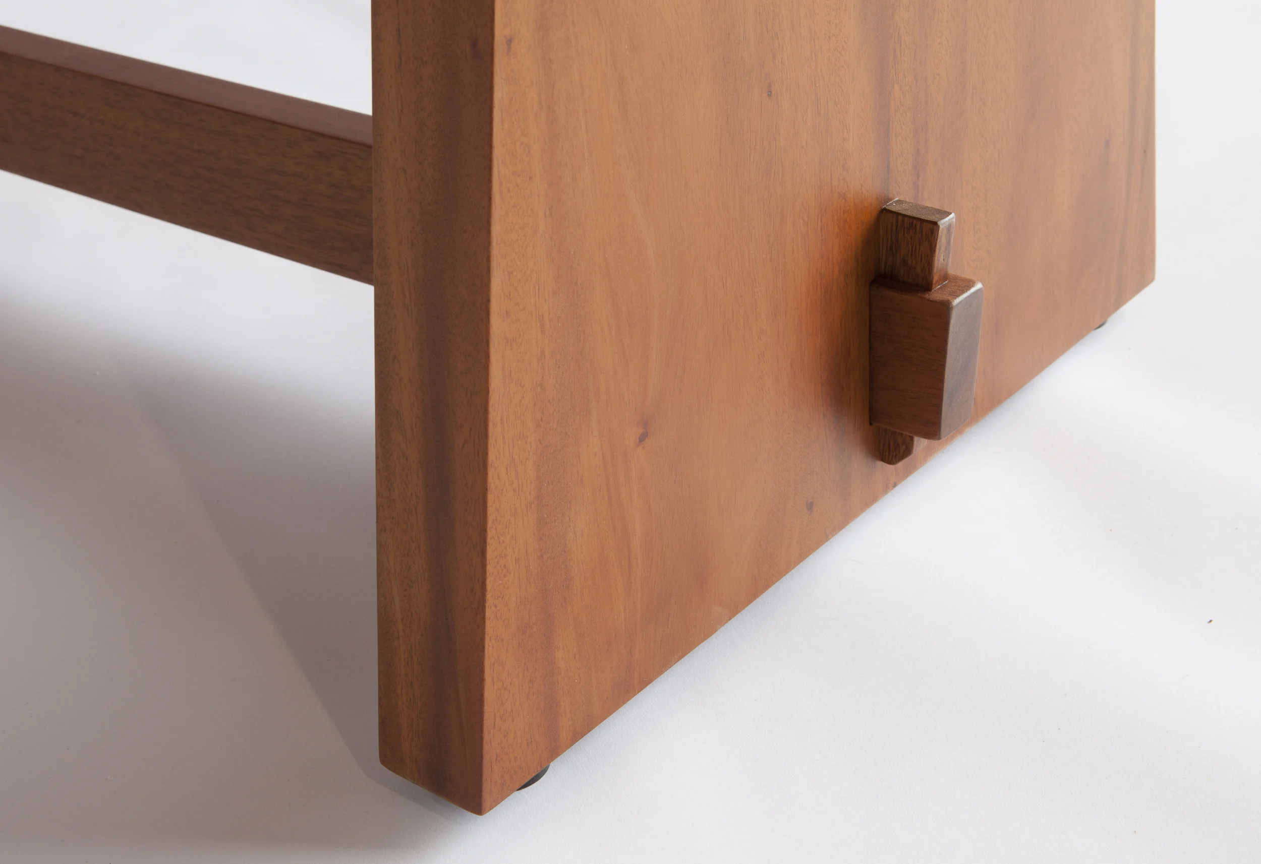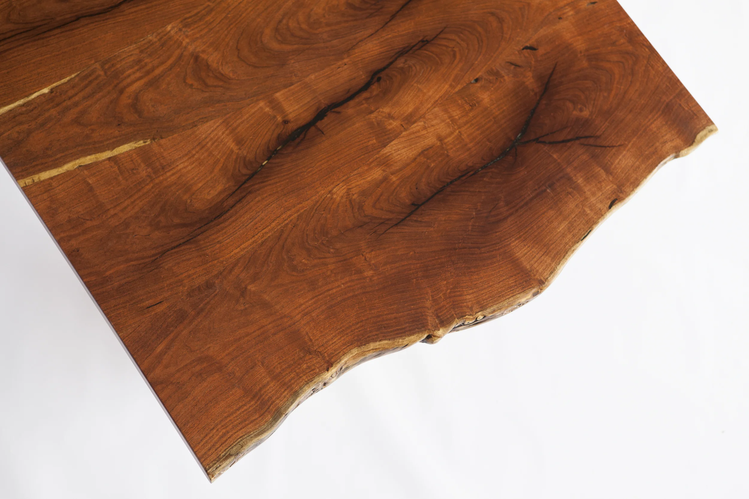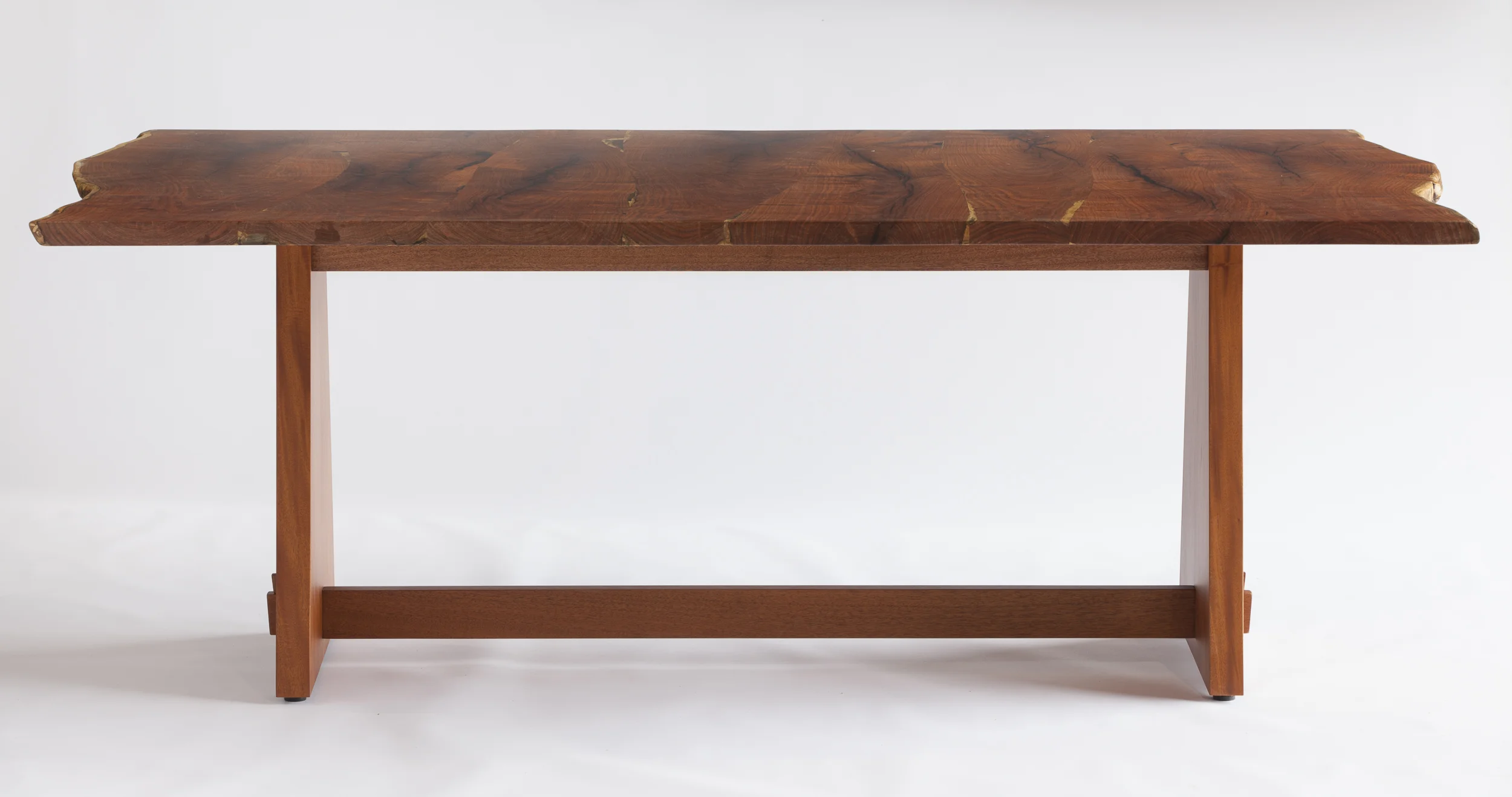 This "live-edge" table features slabs hewn from south Texas mesquite. It displays a tabletop dimension of 79" x 42" and stands 29" high. The african mahogany base follows a more contemporary "trestle" design.
